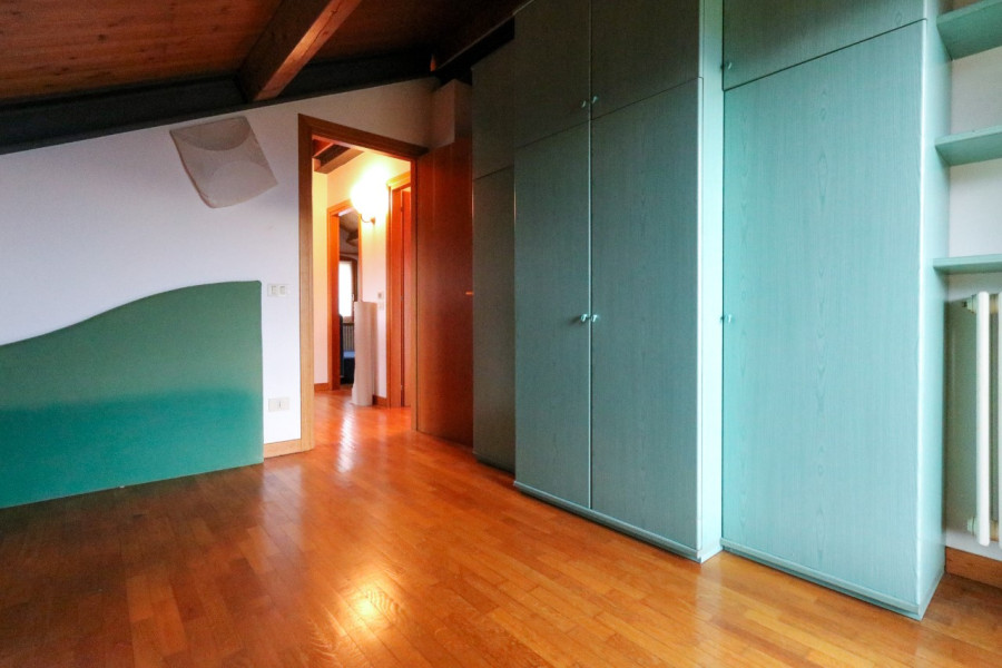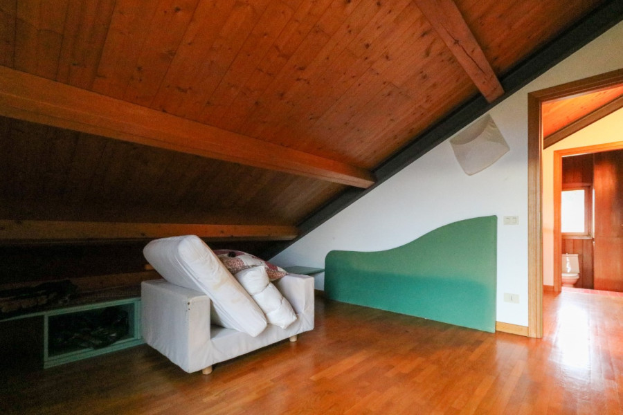 Al primo piano, mansardato, si sviluppa la zona notte con tre stanze e un bagno, in un ambiente caldo e accogliente.